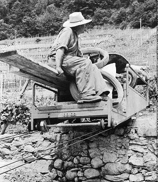 Fred Scherer hat dieses System 1964 erfunden und die erste Anlage gleich an seinem eigenen Weinberg in den Lavaux erstellt. Von der Strasse ging es hinauf bis zur Waldgrenze. Dieser Prototyp hatte noch keine Fangbremse.