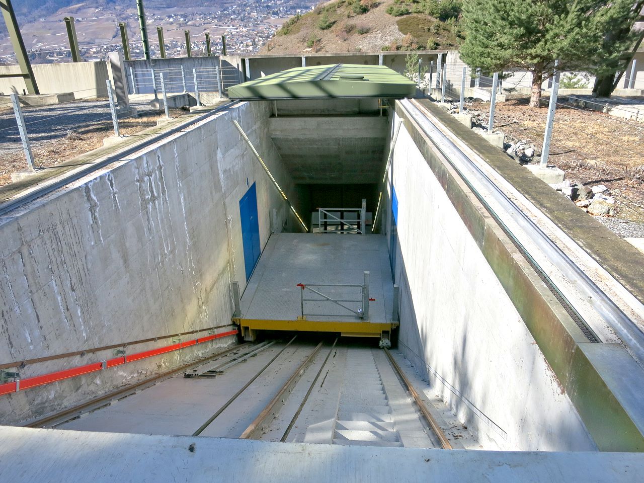 Umweltverbände verhinderten eine Zugangsstrasse zur Dachebene der Anlage. Aus diesem Grund baute Von Roll 1996 einen imposanten Schrägaufzug für Personen und Materialtransporte bis 20 Tonnen. Baumaschinen und schwerste Lasten werden mit diesem Aufzug auf die Dachebene transportiert.