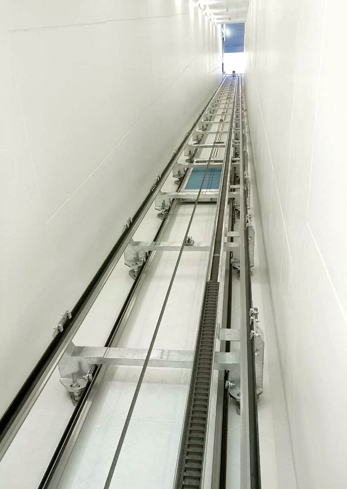 Dieser Schrägaufzug der Firma AS Aufzüge AG (Schindler Gruppe) fährt im Parkhaus Serletta in St. Moritz.