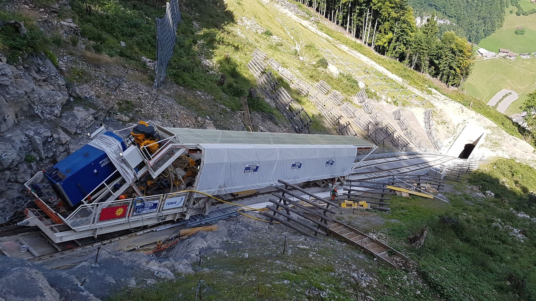 Wegen der enormen Steigung gibt es 86 Niederhalter für das Zugseil und das Gegenseil. Diese Niederhalterrollen verhindern, dass die Seile meterhoch abheben.