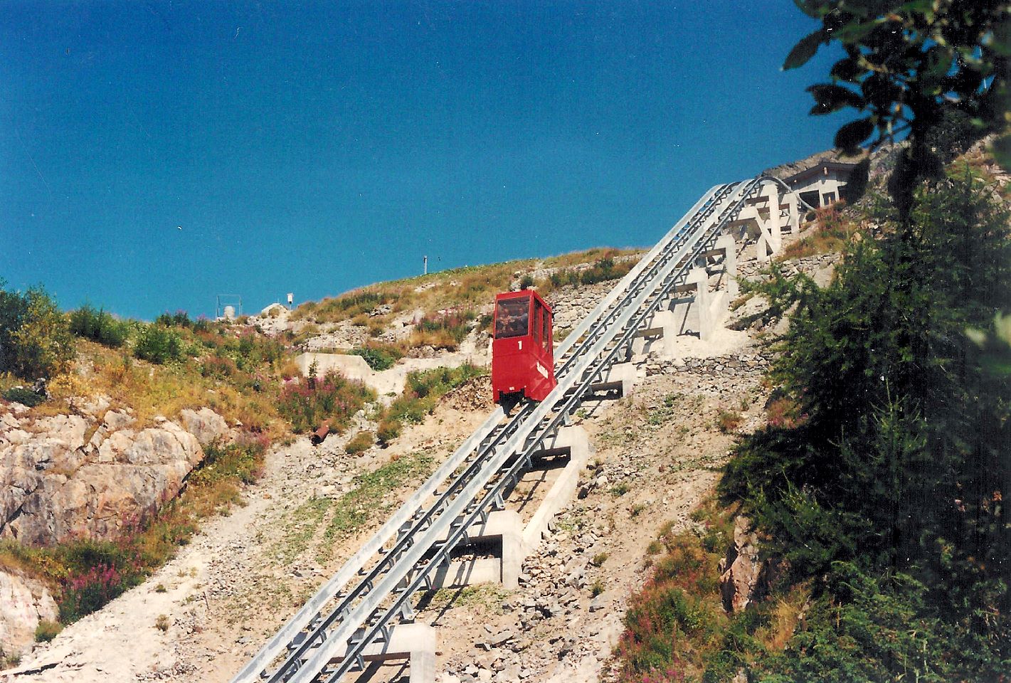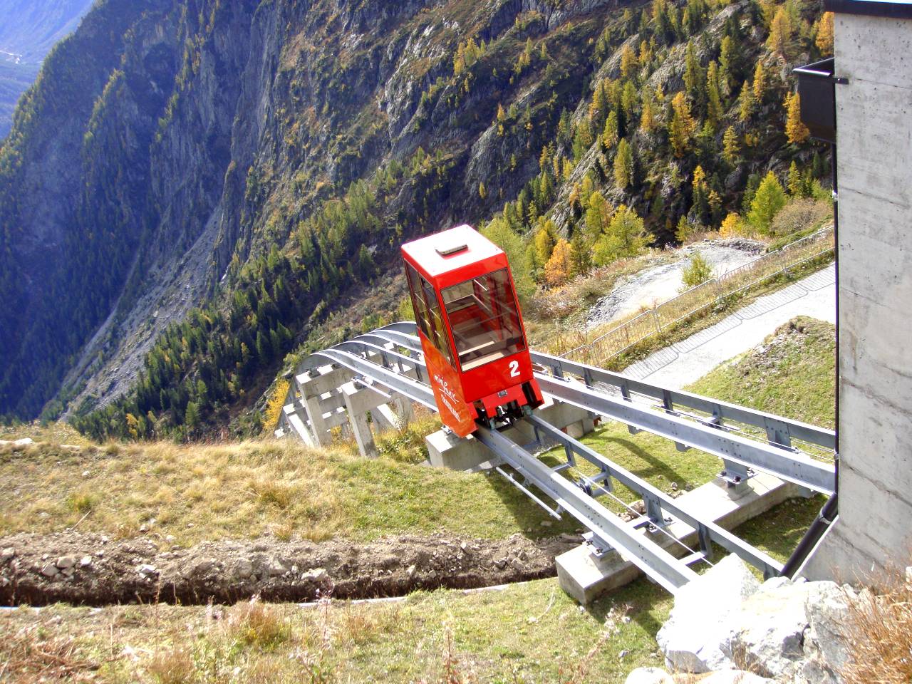Da die Kapazität dieses Monoracks dem immer stärker werdenden Ansturm zuletzt in keiner Weise mehr genügte, baute Niederberger als Ersatz diese Standseilbahn. Eröffnung war 1991. Die Kabinenböden dieser steilen Anlage bleiben durch den eingebauten Niveauausgleich immer horizontal. Besonders bei der Talfahrt eine eindrucksvolle Bahn !