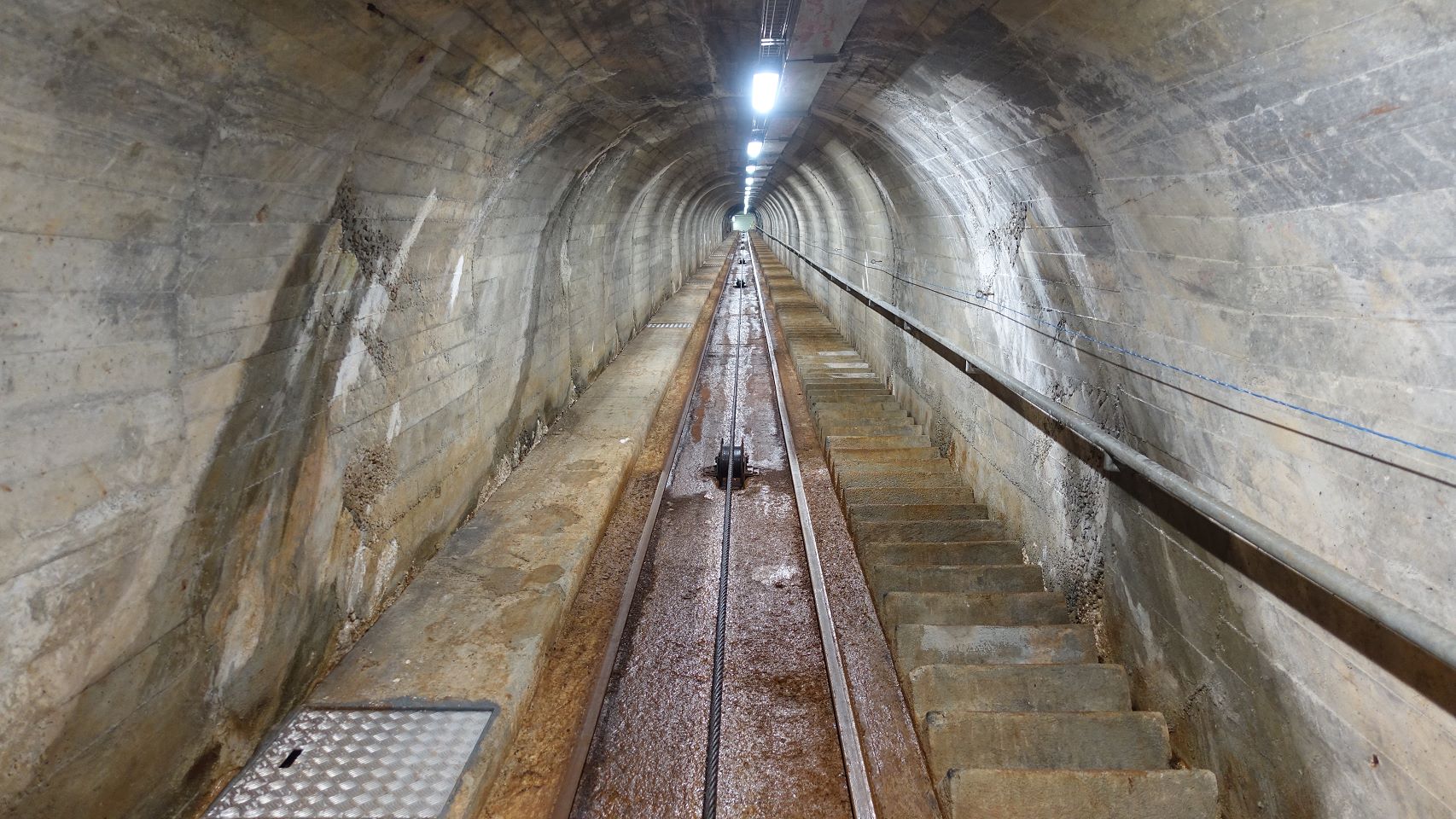Der Staudamm ist 155 Meter hoch und 540 Meter breit. Im Inneren fährt diese Windenbahn vom Windenhaus hinunter zur Grundablasskammer. Die Länge der eigentlichen Steilstrecke entlang der Treppe beträgt 127 m.