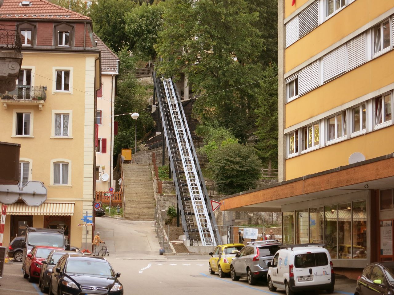 Seit dem 1. September 2014 verbindet dieser Schrägaufzug die Stadt Le Locle mit dem 24 Meter höher gelegenen Bahnhof.