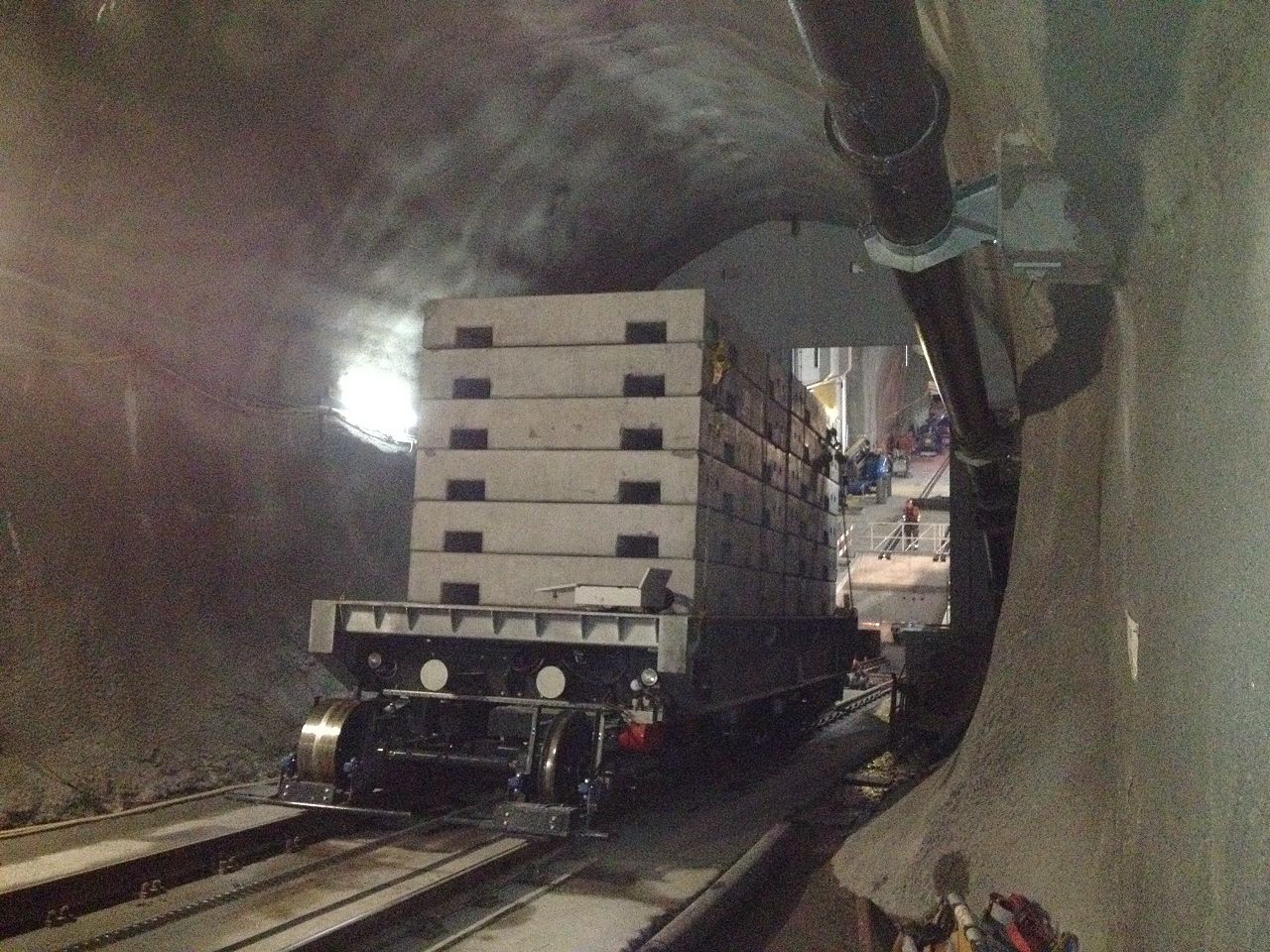 Ab 2010 wurde der fast 4 Kilometer lange Zugangsstollen 1 mit einer riesigen Tunnelbohrmaschine erstellt. Bis zum Ende der Bohrarbeiten war hier eine Bau-Standseilbahn im Einsatz, welche mit dem Vortrieb im Tunnel immer länger wurde.