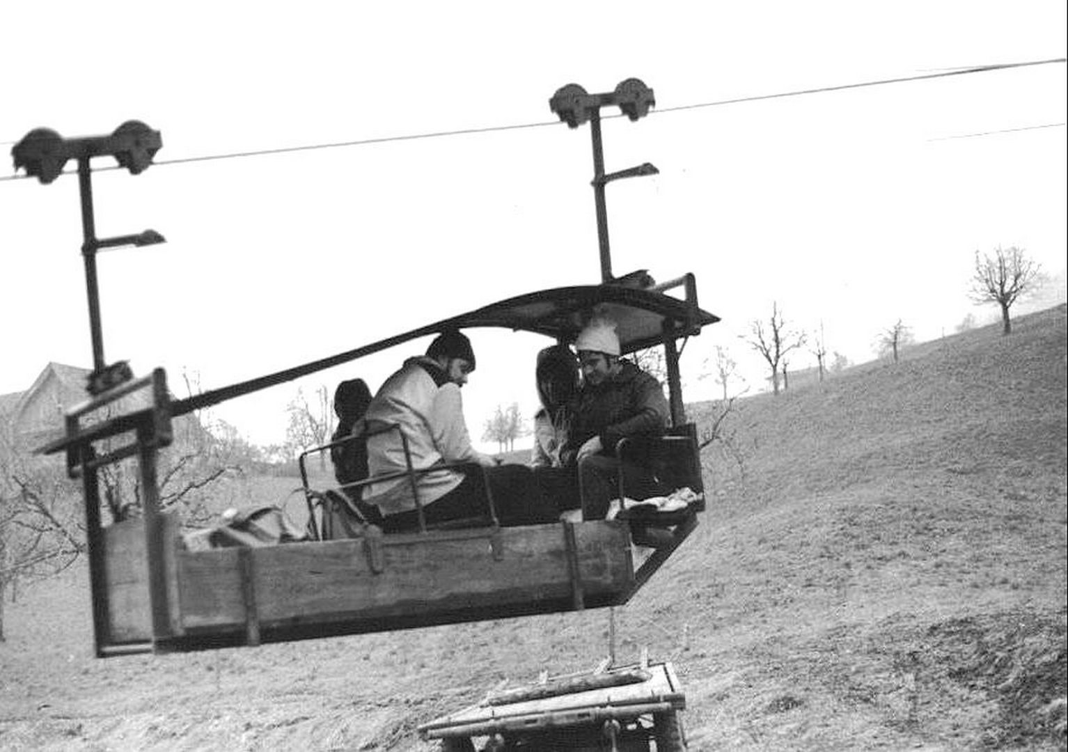 Dieses Niederberger Schiffli war ab 1948 für Holztransport in Betrieb. Eine offizielle Bewilligung für den Personentransport erhielt diese Seilbahn nach einem Umbau im Jahr 1968.
