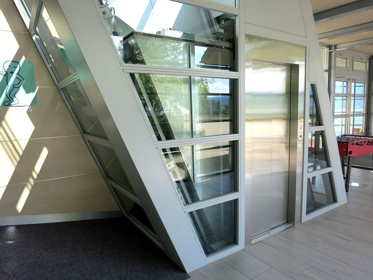 2000/2001 gab es eine Vergrösserung mit neuen Gebäuden und Ebenen. Für die Erschliessung dieser Stockwerke wurde dieser spezielle Schrägaufzug der Firma Henseler Aufzüge eingebaut.